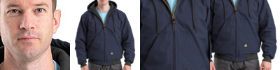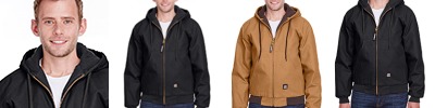 10 oz., heavy-duty cotton duck; Heavyweight quilt-lined taffeta liner; Water-repellent finish; Triple-needle stitched main seam; Heavy-duty brass zipper; Three-piece insulated hood with drawstring; Pleated action back; Pleated elbows; Two front patch pockets; Three inside pockets; Manufactured in a LEED (Leadership in Energy and Environmental Design) certified factory;