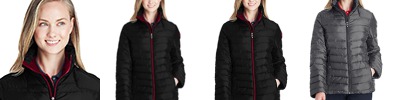 100% polyester nail head weave fabric; 300 gsm, 100% synthetic down insulation; Micro-brushed tricot inner collar piecing; Invisible zipper inside chest for embroidery access; Princess seams for feminine silhouette; Zippered handwarmer pockets inset into princess seams; Modern fit;