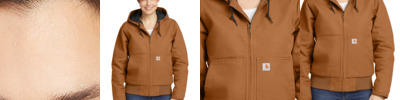 This ladies version is an update to a Carhartt icon-the WJ130. Tough on the outside and warm on the inside, it's also sanded and brushed for softness. 12-ounce, 100% ring spun cotton washed duck Quilted nylon lining for easy on and off; 80-gram, 100% polyester 3M Thinsulate featherless insulation for warmth without the weight Attached quilted-flannel-lined three-piece hood with drawcord closure Full-length brass front zipper Two interior pockets: one zippered, one hook and loop Two large hand pockets Pen stall in right pocket Locker loop Elbow pleats for ease of movement Rib knit cuffs and waistband Carhartt-strong, triple-stitched main seams Carhartt label sewn on left pocket Carhartt Warmth Rating Earned: Level 3â¿¿Warmest Loose fit