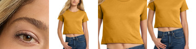 3.5-ounce, 65/35 poly/combed ring spun cotton, 40 singles 1x1 rib knit neck Raw edge sleeves and hem Tear-away label Side seamed Cropped body with relaxed fit