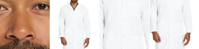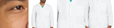 65/35 poly/cotton poplin Locker loop Left chest pocket with pen slot Top-loading front pockets Interior tablet pocket Side seam opening for easy access to pants pockets Back yoke 4-button placket opening Center back vent Wink heat transfer logo at left pocket Size medium: 38-inch back length