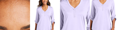 A polished look is easily achieved in this elevated style that combines professionalism with snag- and odor-resistance, plus moisture wicking performance. 5.6-ounce, 94/6 poly/spandex jersey Snag-resistant Stretch Moisture-wicking Odor-resistant Easy Care Y-neck collar and placket Back yoke with center back pleat Roll sleeves with button tab cuffs Longer length Rounded drop tail hem Tag-free label
