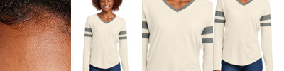 Show off your team spirit with this fashion-inspired tee. 4.5-ounce, 60/40 combed ring spun cotton/polyester V-neck Self neck tape Tear-away label Crossover at center neck trim Raglan sleeves Colorblock detail at neck and sleeve stripes Curved hem with slight drop at back