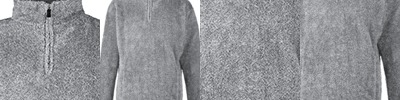 7.5 oz., 100% polyester multicolored shag; Unconcealed nylon zipper; Stand-up self-collar; Sideseam welt pockets; Single needle stitched throughout; Tear away label;