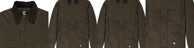 12 oz., super-duty 100% washed cotton duck; Arctic-weight quilt lined taffeta; Brass zipper with a hook and loop storm flap; Two chest pockets with hook and loop closures; Pleated elbows and action back; Side vents with snap closure; Hidden knit storm cuffs;